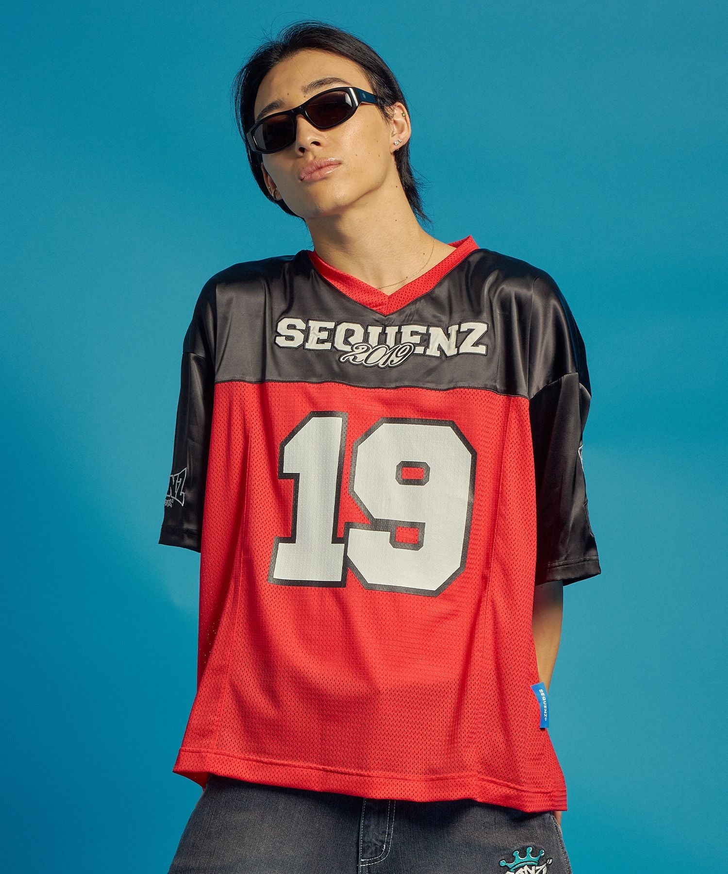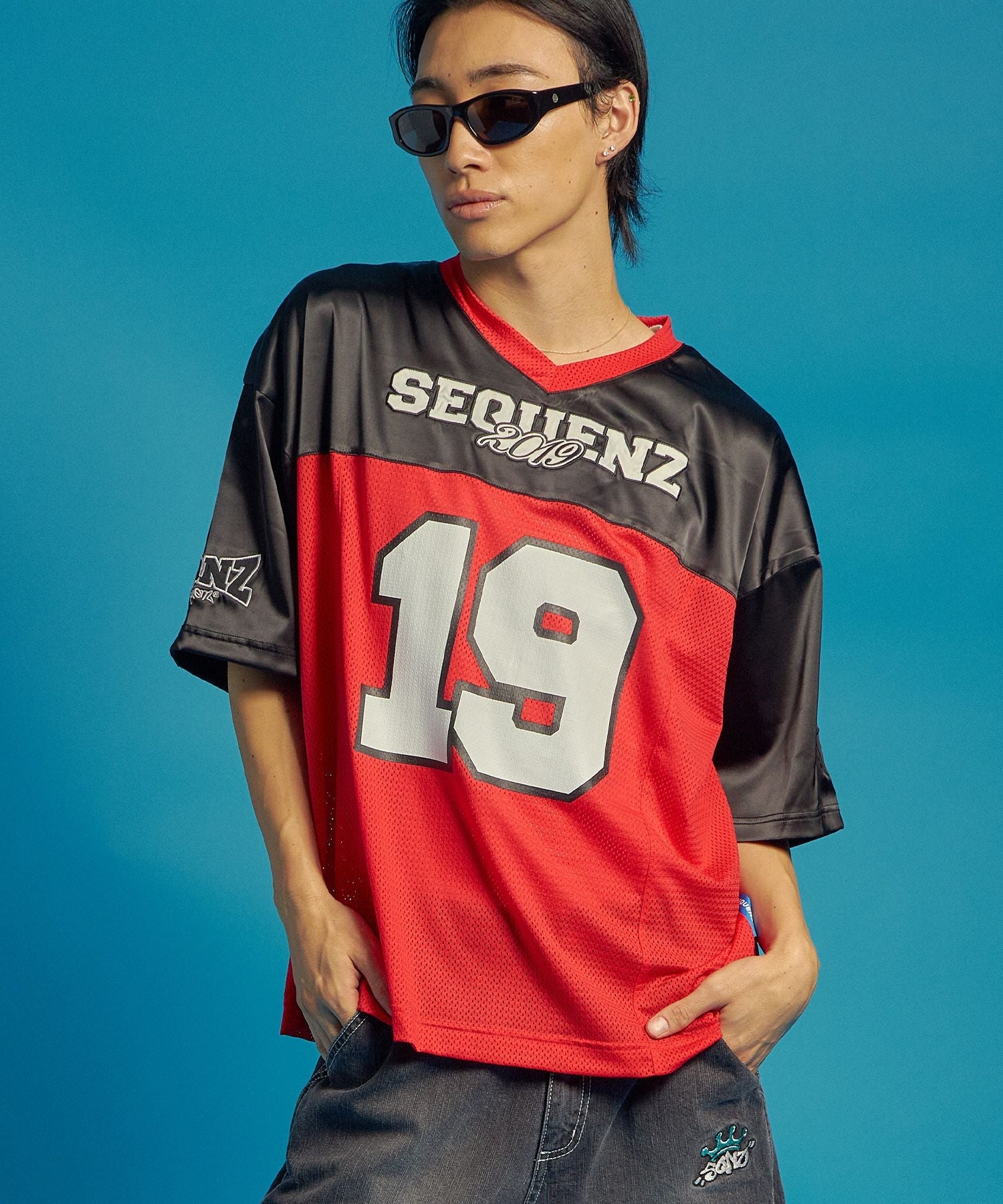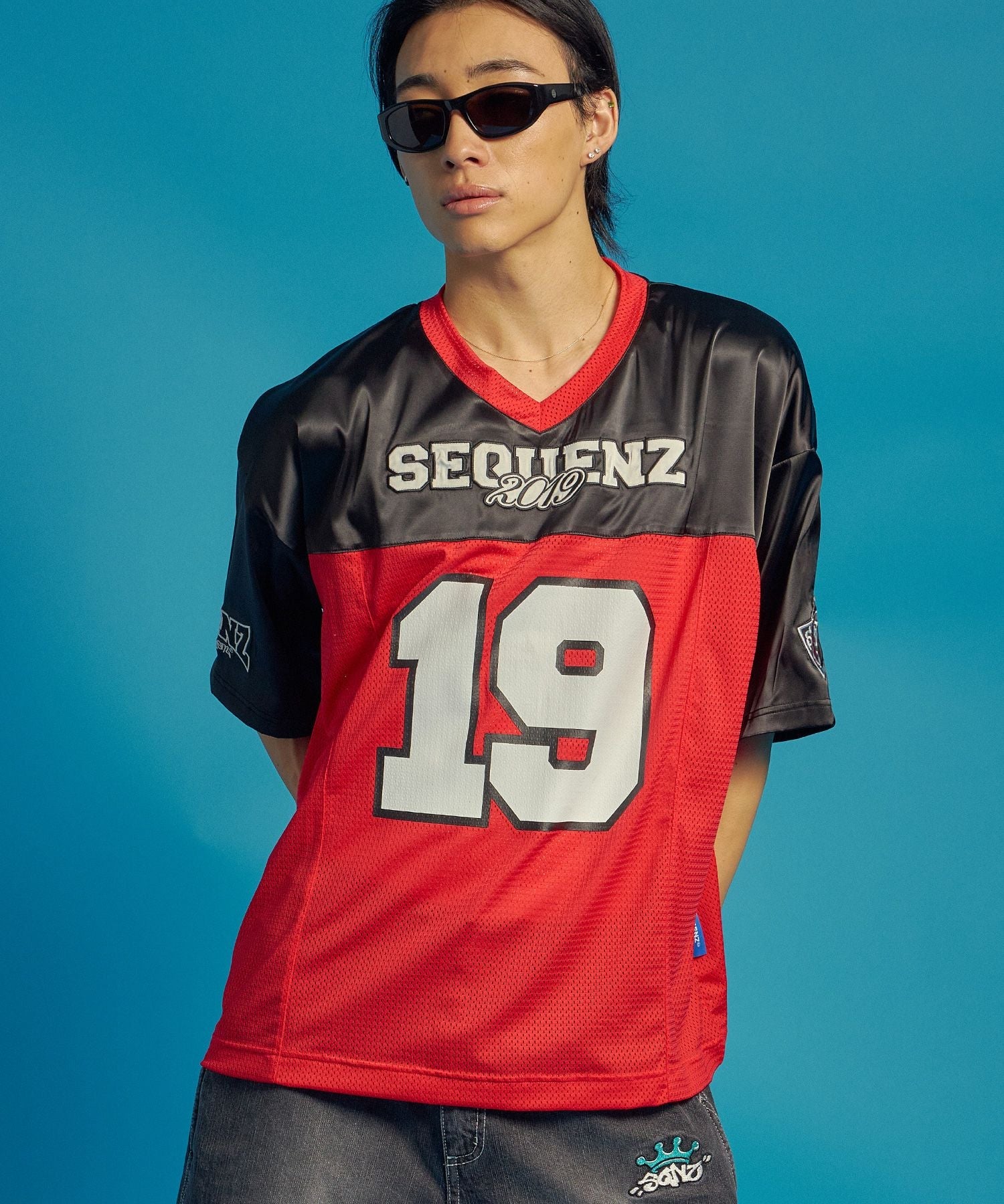シークエンズからサテン×メッシュ生地の合わせでレディースにもおすすめな大注目のフットボールシャツが新登場!左右の袖にワッペンを施し、ナンバリングのラバープリントがストリート系スポーティー系にハマる洗練された雰囲気をプラスします。おすすめカラーは、サーモンピンク×カーキでトレンド感満載の夏必須アイテムとなっております。全体的にシンプルに作り上げていて、トレンドのサイジングに仕上げており旬なスタイリングも楽しめ、ストリート系のコーデにも非常に合います。ザ・ベーシックなブラック、レッド、ネイビーカラーに加え、おすすめなトレンドのカーキカラーも展開。