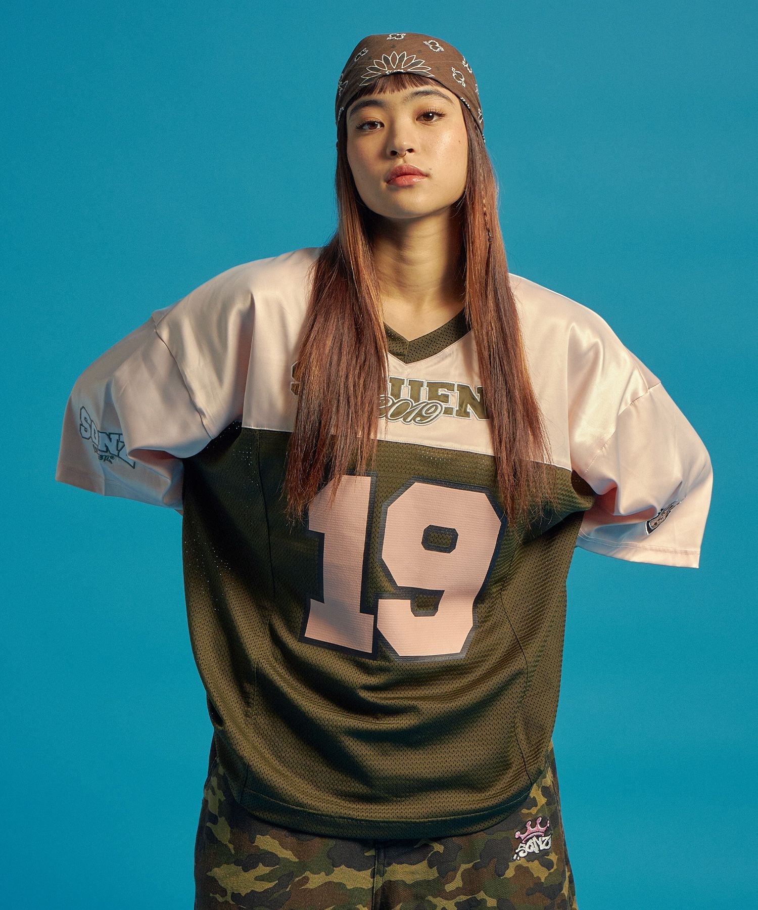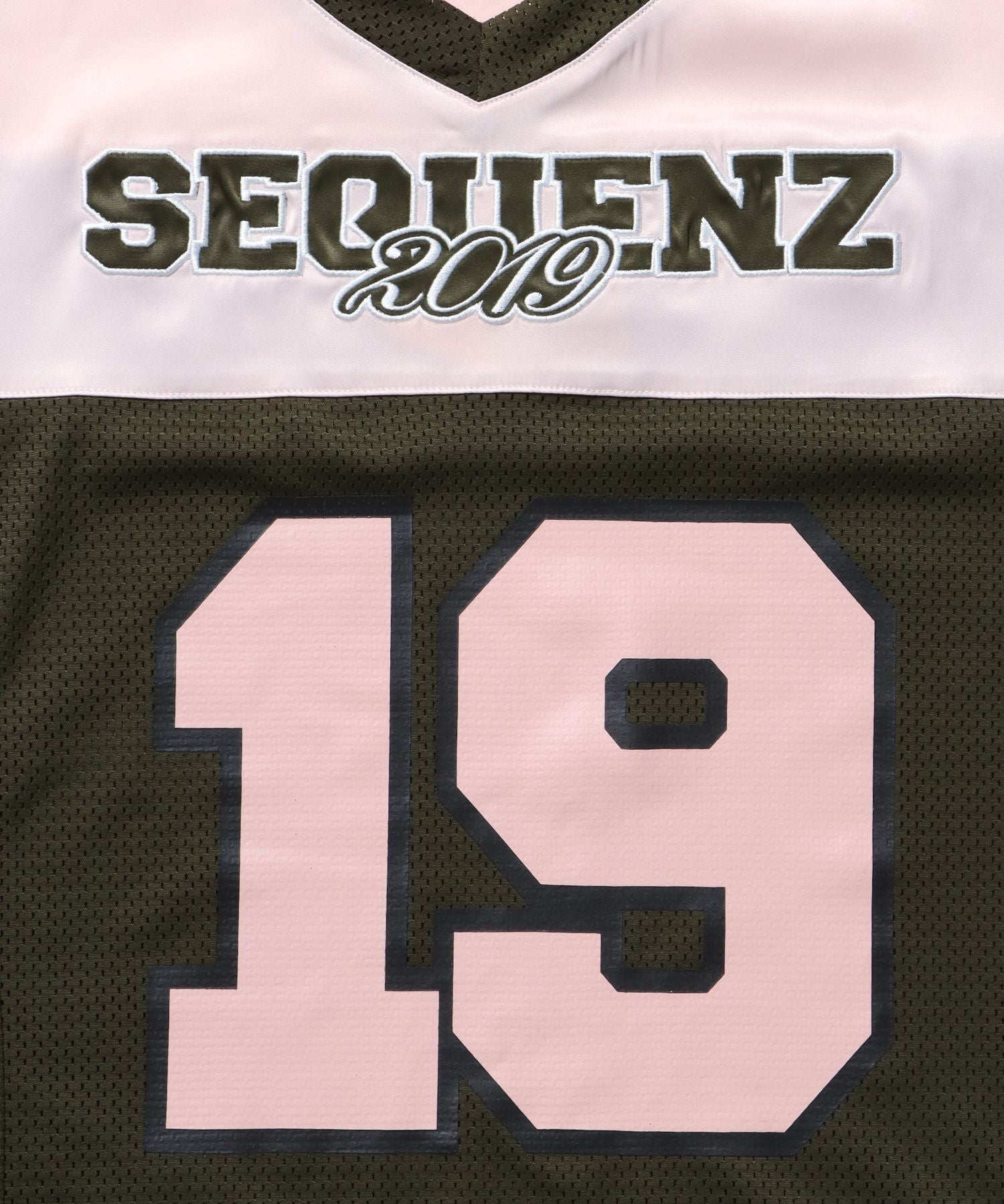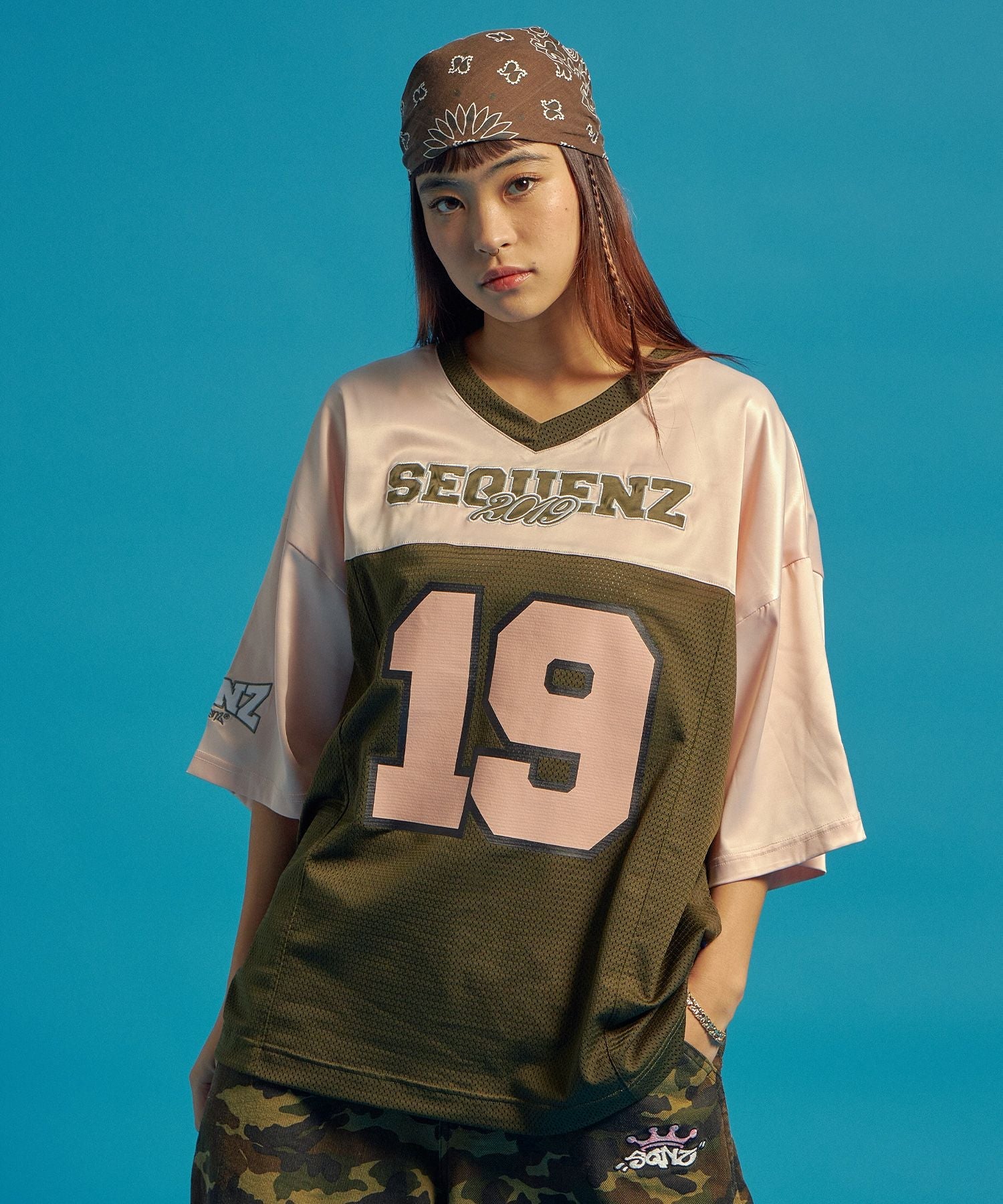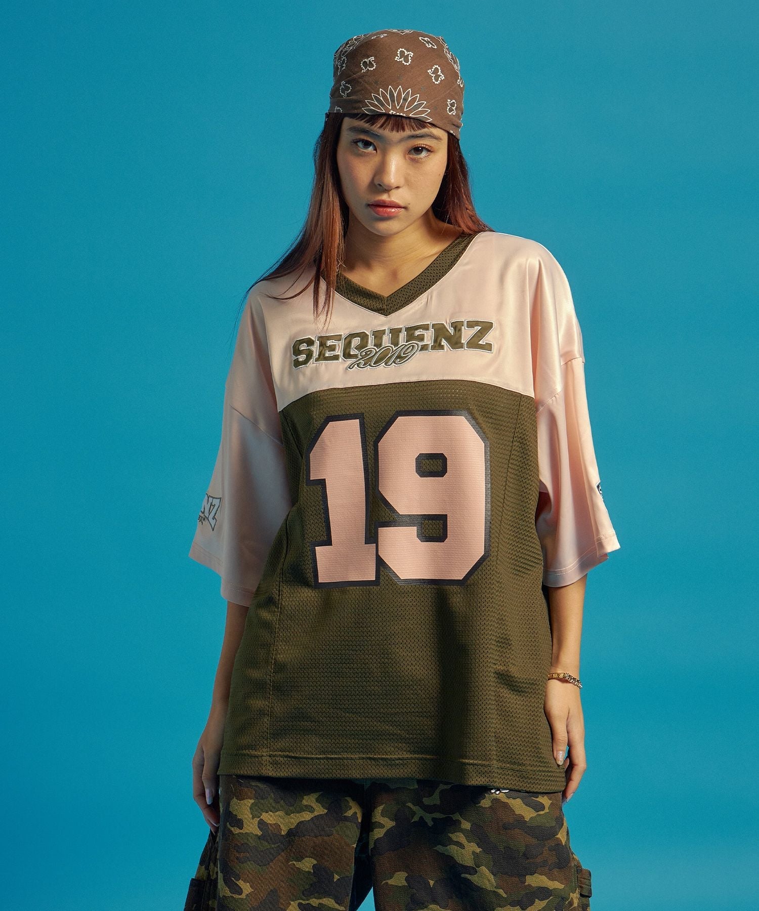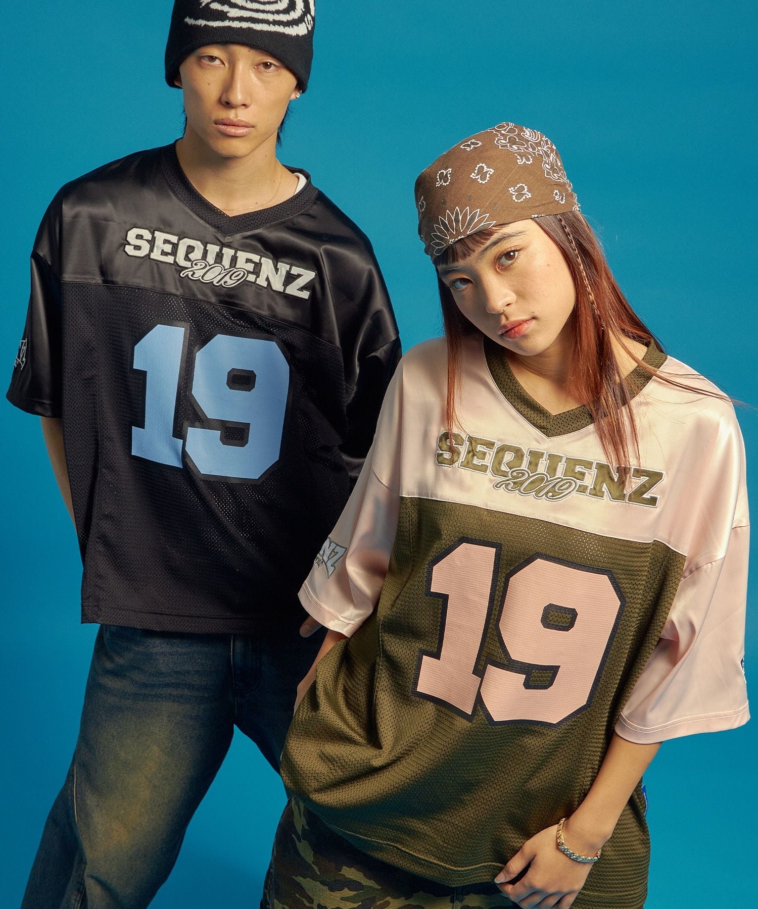 シークエンズからサテン×メッシュ生地の合わせでレディースにもおすすめな大注目のフットボールシャツが新登場!左右の袖にワッペンを施し、ナンバリングのラバープリントがストリート系スポーティー系にハマる洗練された雰囲気をプラスします。おすすめカラーは、サーモンピンク×カーキでトレンド感満載の夏必須アイテムとなっております。全体的にシンプルに作り上げていて、トレンドのサイジングに仕上げており旬なスタイリングも楽しめ、ストリート系のコーデにも非常に合います。ザ・ベーシックなブラック、レッド、ネイビーカラーに加え、おすすめなトレンドのカーキカラーも展開。