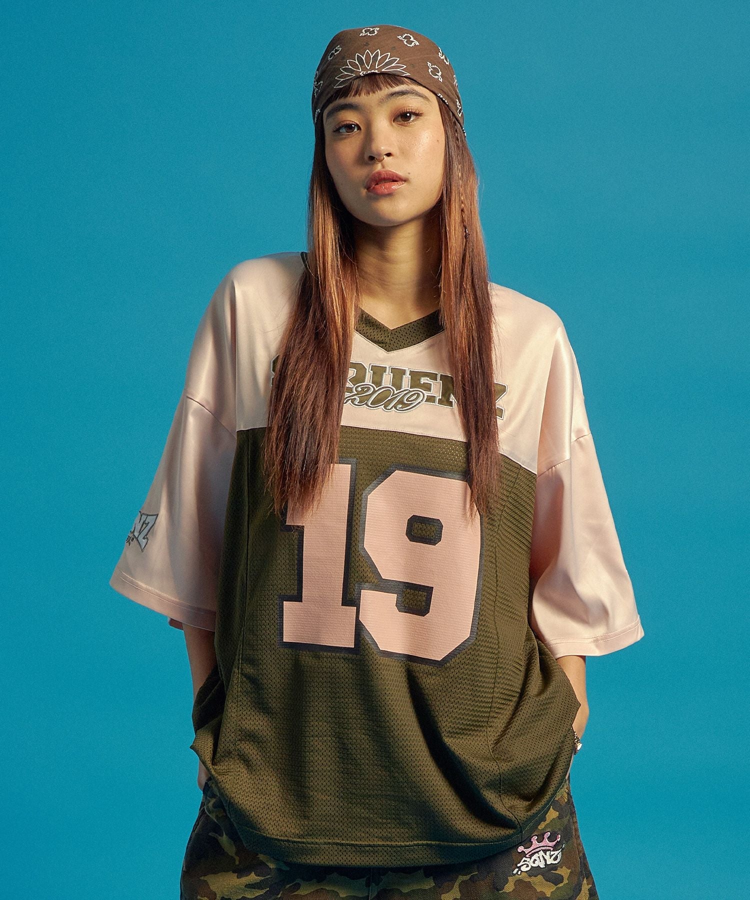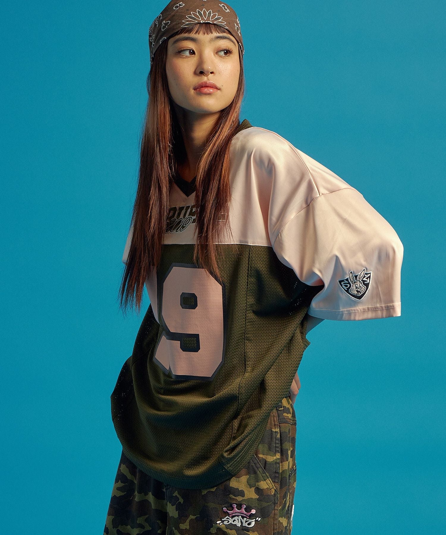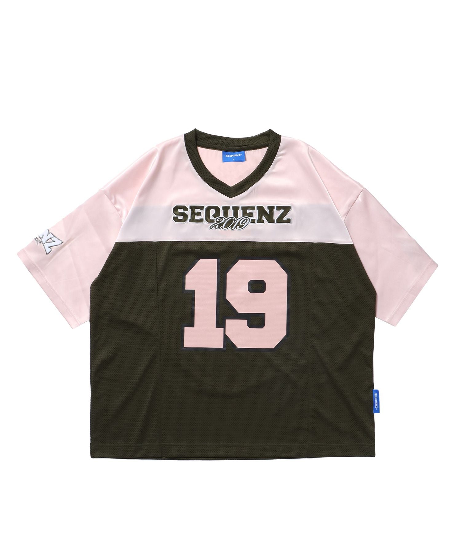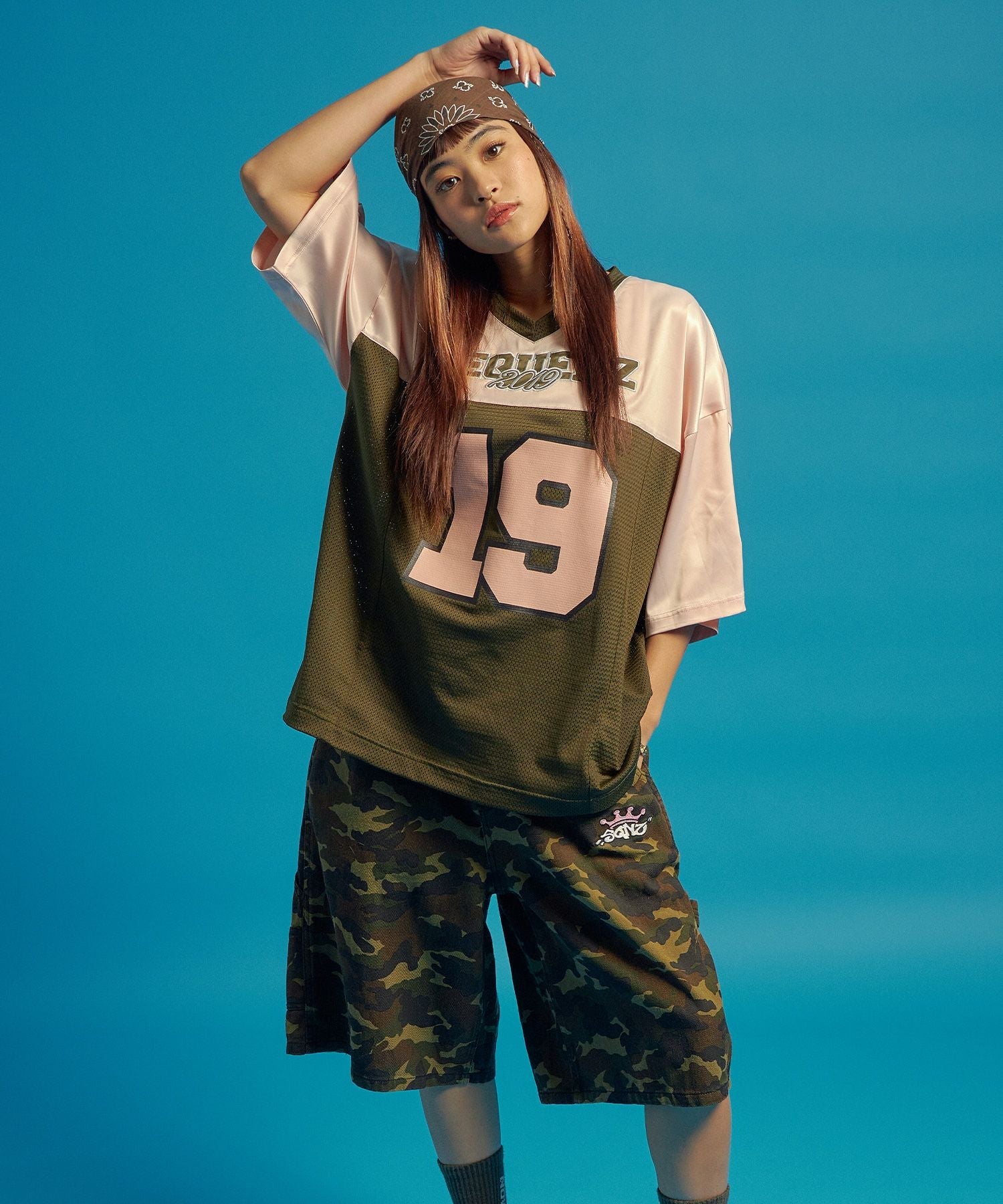シークエンズからサテン×メッシュ生地の合わせでレディースにもおすすめな大注目のフットボールシャツが新登場!左右の袖にワッペンを施し、ナンバリングのラバープリントがストリート系スポーティー系にハマる洗練された雰囲気をプラスします。おすすめカラーは、サーモンピンク×カーキでトレンド感満載の夏必須アイテムとなっております。全体的にシンプルに作り上げていて、トレンドのサイジングに仕上げており旬なスタイリングも楽しめ、ストリート系のコーデにも非常に合います。ザ・ベーシックなブラック、レッド、ネイビーカラーに加え、おすすめなトレンドのカーキカラーも展開。