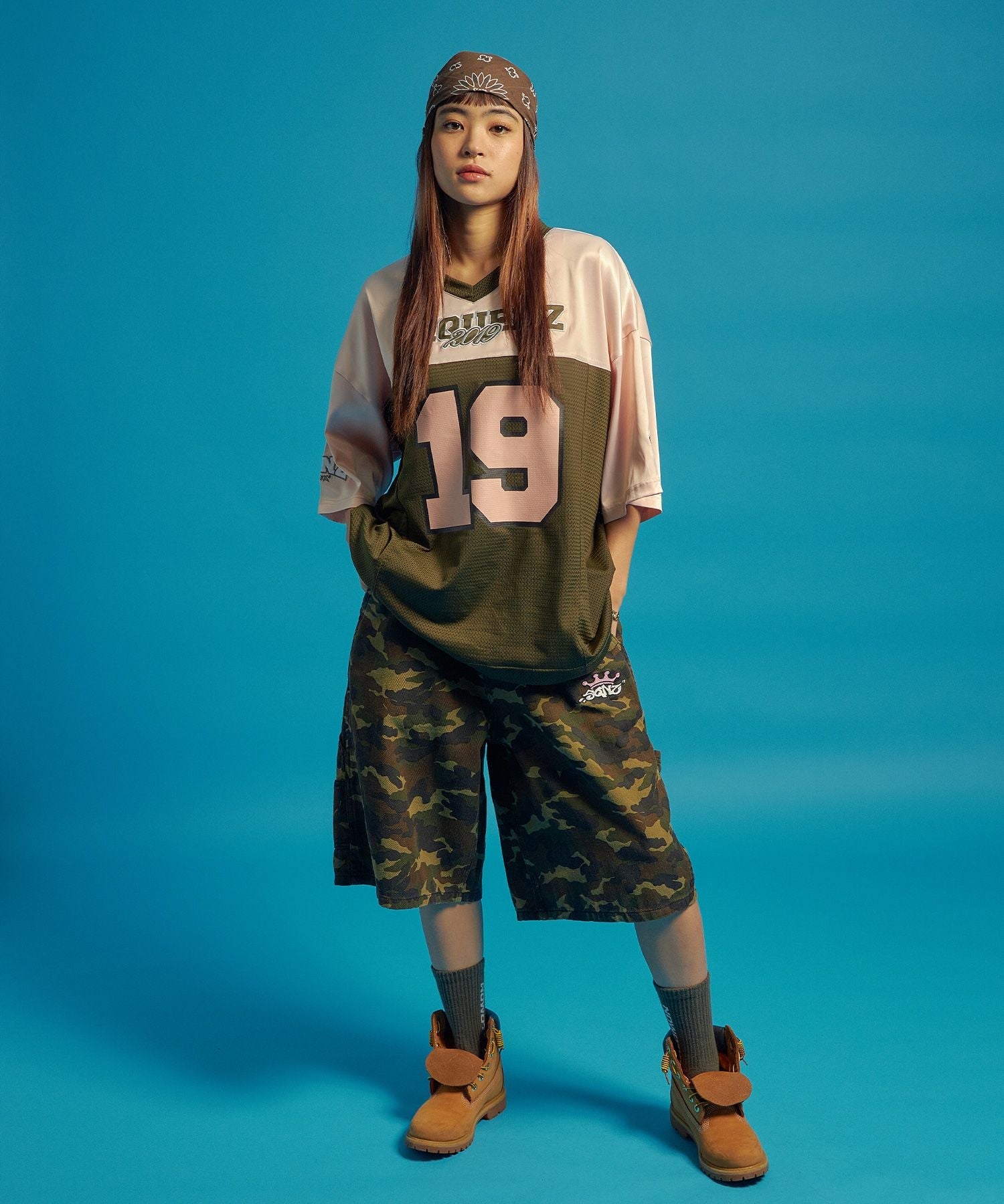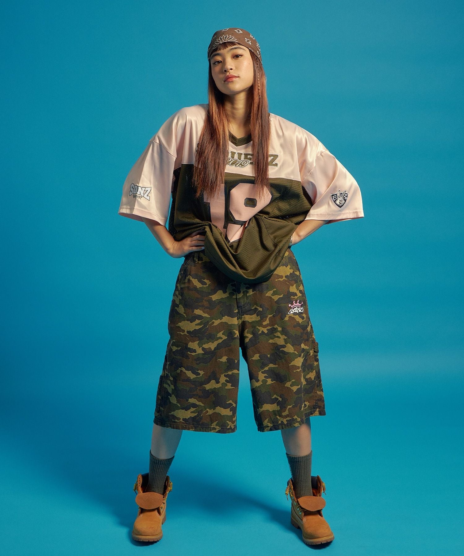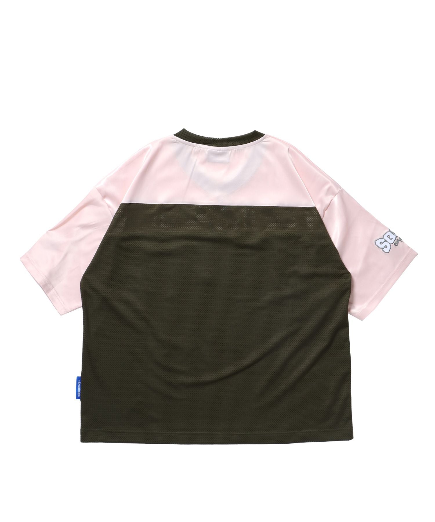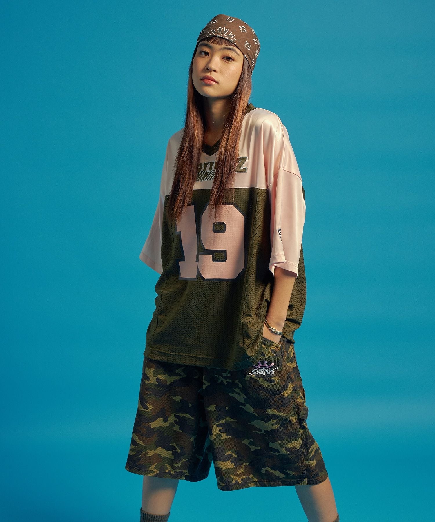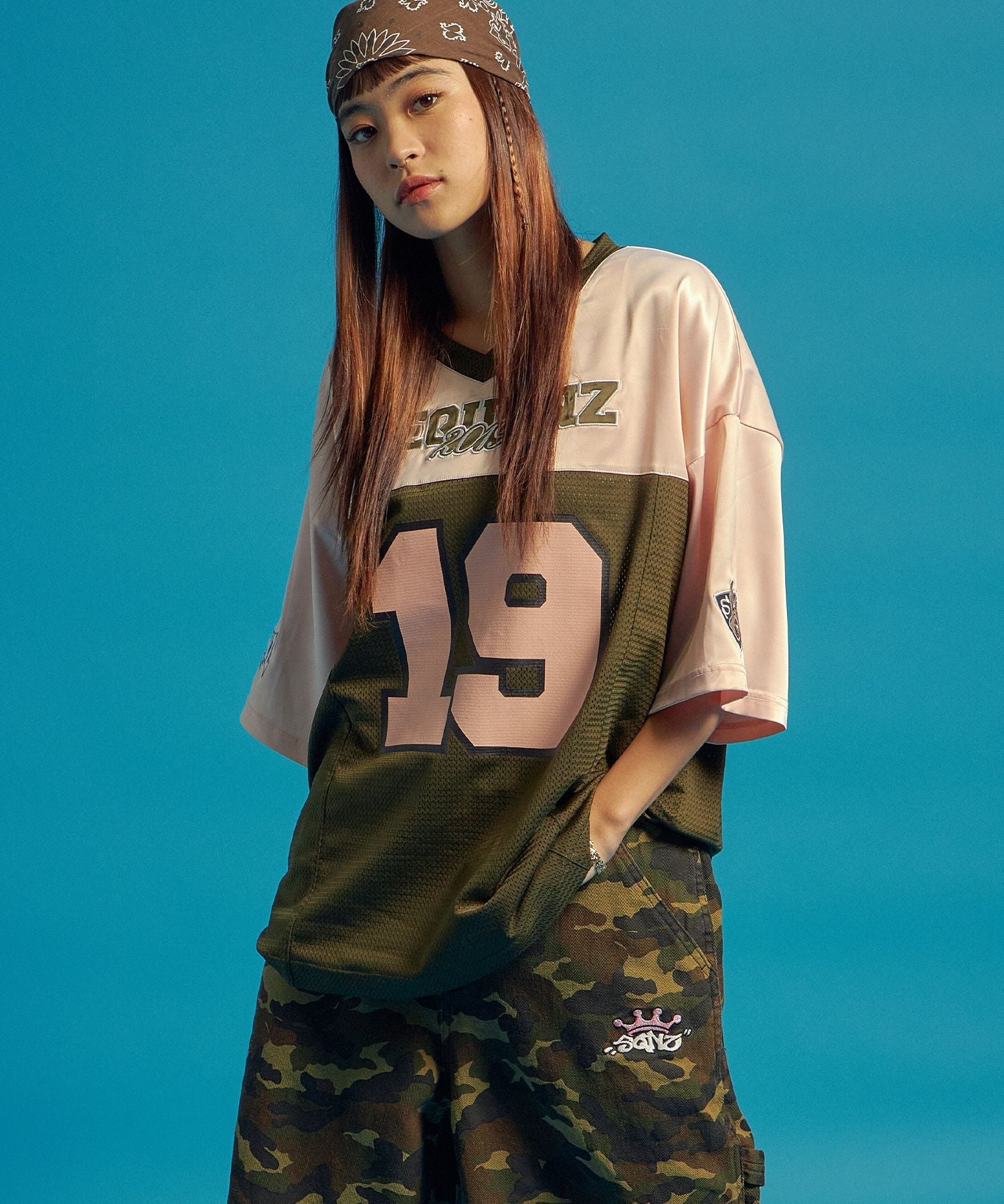 シークエンズからサテン×メッシュ生地の合わせでレディースにもおすすめな大注目のフットボールシャツが新登場!左右の袖にワッペンを施し、ナンバリングのラバープリントがストリート系スポーティー系にハマる洗練された雰囲気をプラスします。おすすめカラーは、サーモンピンク×カーキでトレンド感満載の夏必須アイテムとなっております。全体的にシンプルに作り上げていて、トレンドのサイジングに仕上げており旬なスタイリングも楽しめ、ストリート系のコーデにも非常に合います。ザ・ベーシックなブラック、レッド、ネイビーカラーに加え、おすすめなトレンドのカーキカラーも展開。